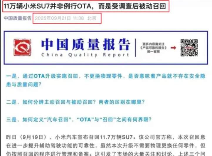 但国家市场监管总局主管媒体的公众号,却发布了一篇文章,标题为《11万辆小米SU7并非例行OTA,而是接受调查后被动召回》。这意味着,官媒直接打脸小米,揭露了小米汽车召回的真相。