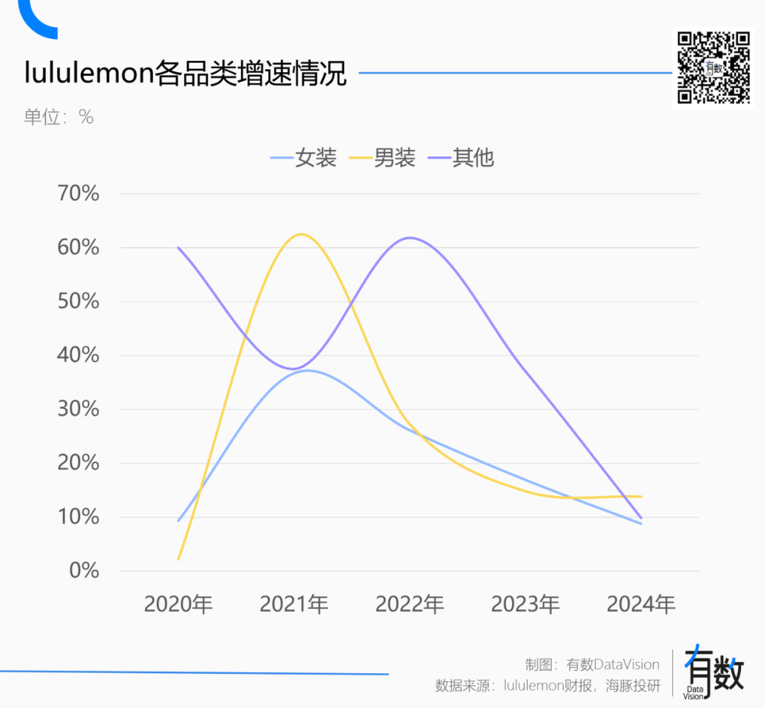 2018-2020财年,lululemon的女装增速从24.3%下滑到9.3%,虽然疫情期间短暂回升,但很快回落到2024财年的9%。截至2025财年第一季度,lululemon女装业务增速仅为7%。