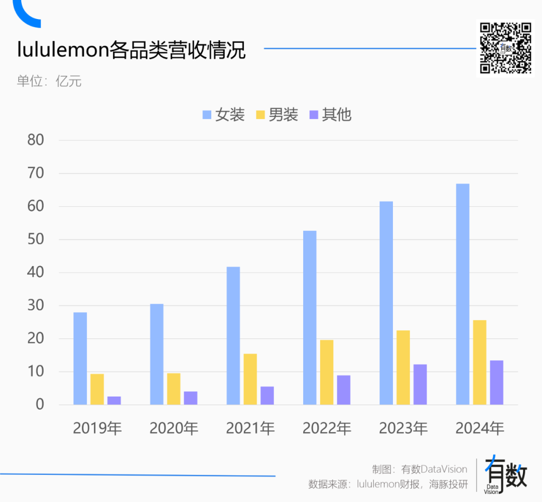 2019年到2024年,lululemon收入结构中男装占比从23.5%上涨到25.2%,几乎可以忽略不计。