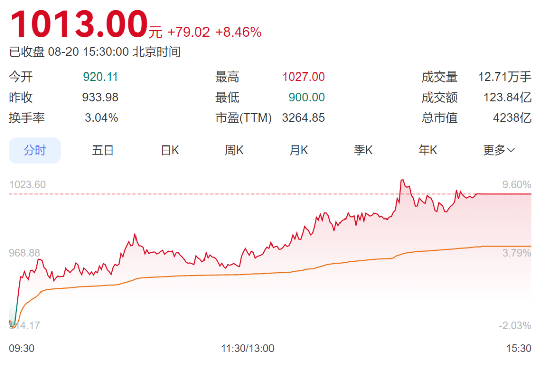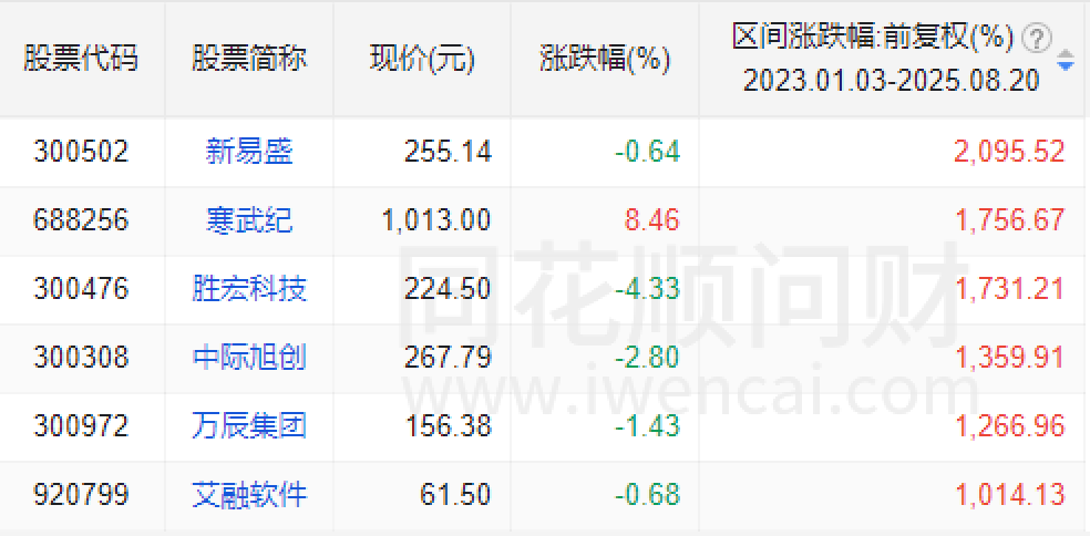 今天,寒武纪再次暴涨8.46%,史上首次稳稳站上1000元,收在1013元。从2023 年1月至今,涨幅高达1756.67%——妥妥的十倍股!