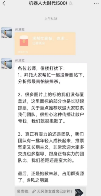 对于网传8月金股,孙潇雅在微信群中进行了回应,发红包拜托大家帮忙删帖。理由除了分析师害怕被捧杀,还担心这种传播会让散户亏钱,有实力的不是她个人,还是整个团队。