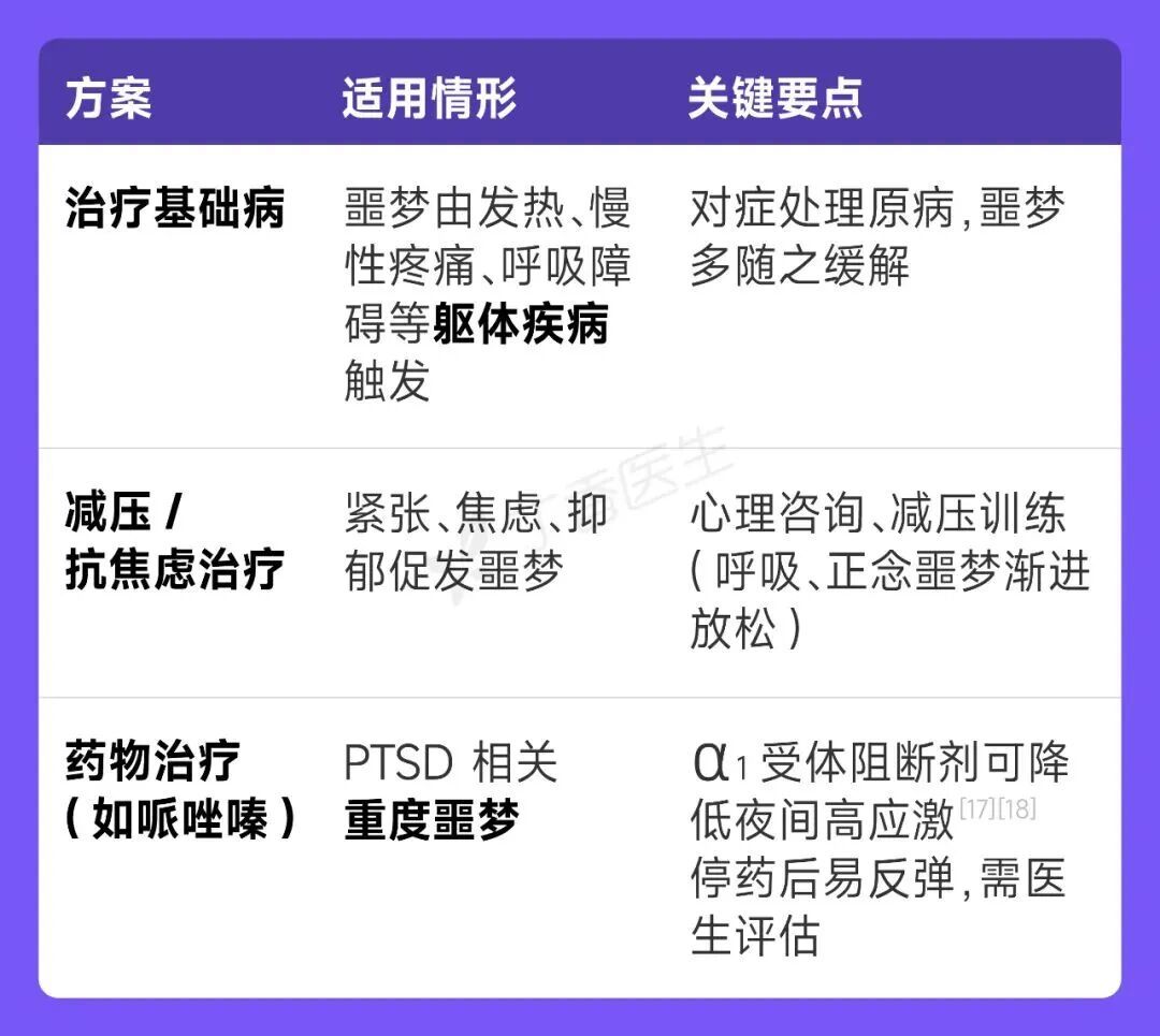 医生会帮助排除噩梦的诱因,通常采取「自上而下」的流程:先进行全面评估(睡眠结构、潜在创伤、精神疾病、用药等),如有必要再进入针对噩梦的专项治疗。[18]