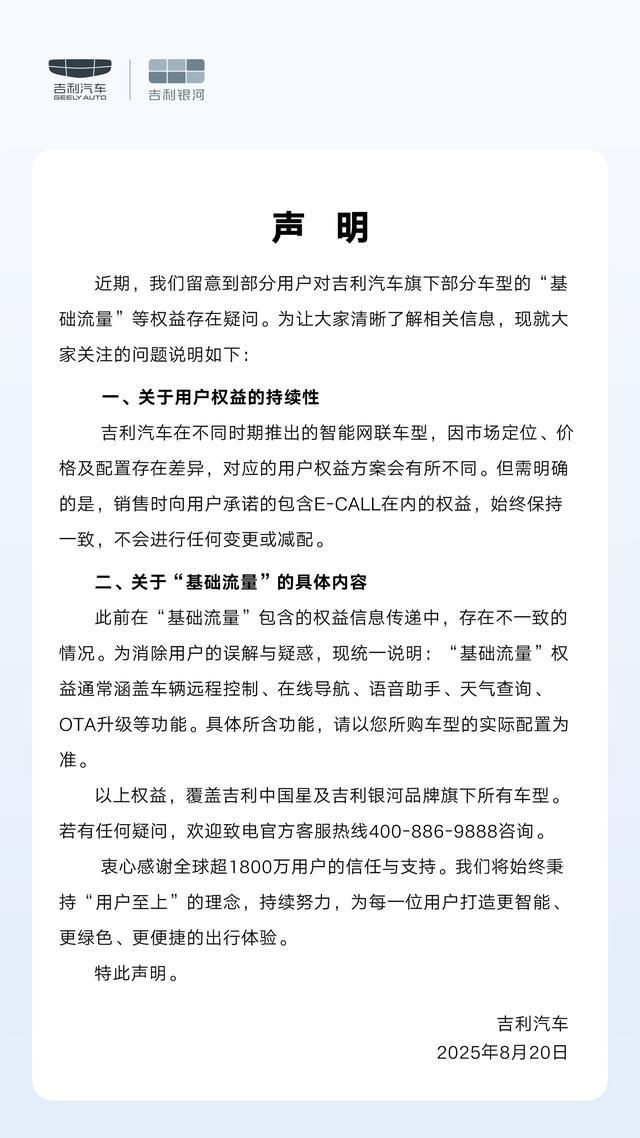 8月20日消息,针对部分用户对吉利汽车旗下车型“基础流量”等权益的疑问,吉利汽车今日发布声明,IT之家附原文如下: