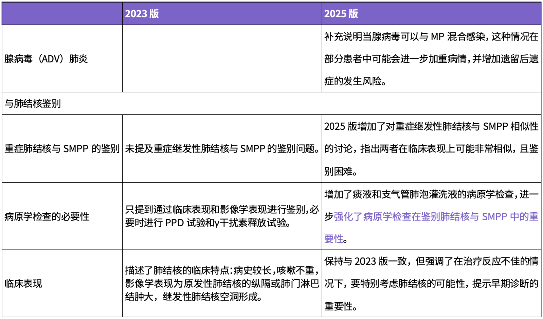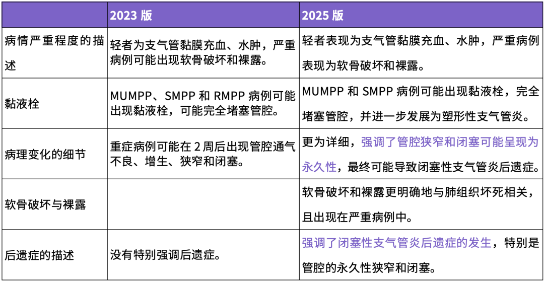 总结而言,2025 版在描述支气管镜下表现时,新增提到了 MUMPP 和 SMPP 患者支气管腔可存在黏液栓,甚至完全堵塞管腔(并发塑形性支气管炎),黏膜可坏死、 脱落或溃疡形成(常预示肺组织也坏死),更加注重病变可能导致的长期后遗症,特别是闭塞性支气管炎。