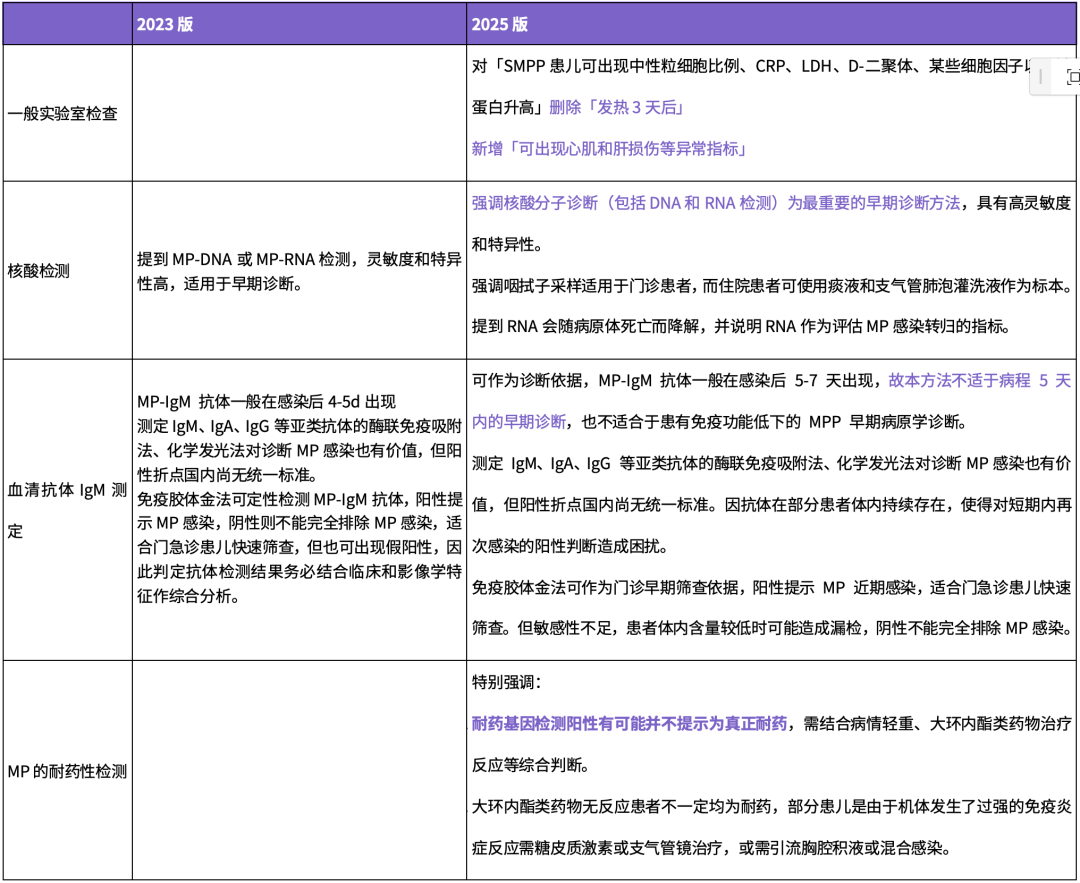 2025 版: 对大环内酯类耐药的关注进一步加强,强调了耐药对RMPP、MUMPP等严重病例的影响,且更加强调早期诊断的重要性。