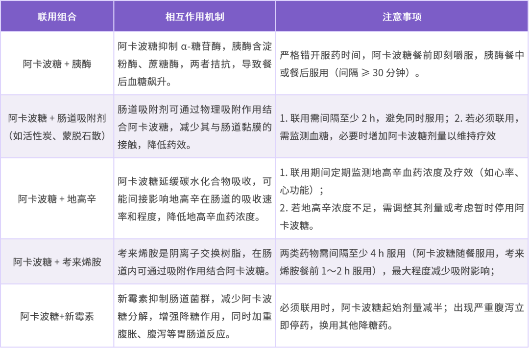 α-糖苷酶抑制剂通过抑制肠道碳水化合物分解降糖,与肠道作用药物(活性炭、蒙脱石散、考来烯胺)相互作用需关注。