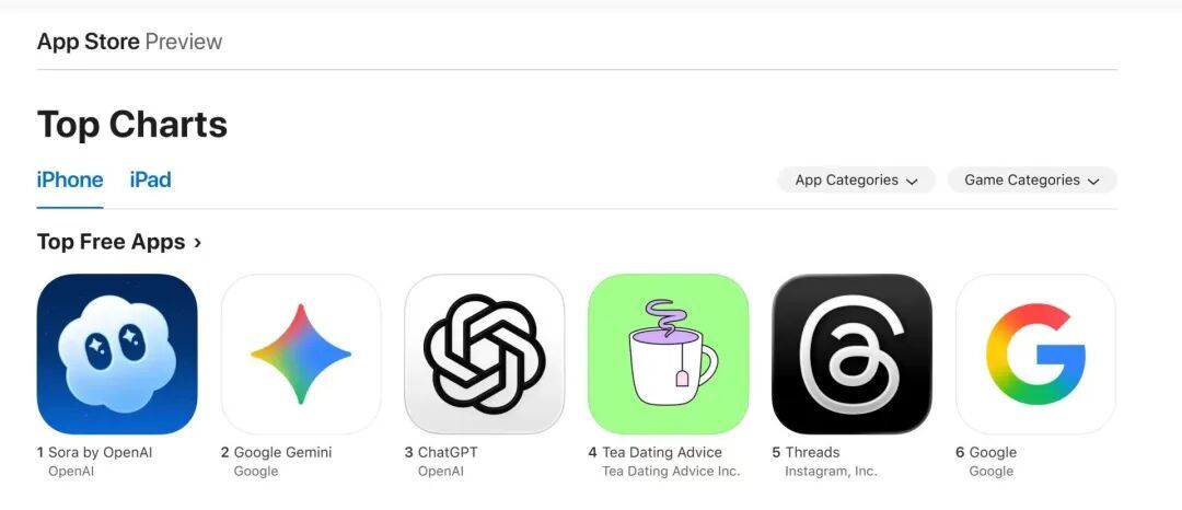 当地时间周五(10月3日),Sora App登顶苹果美国“热门免费应用”榜单。