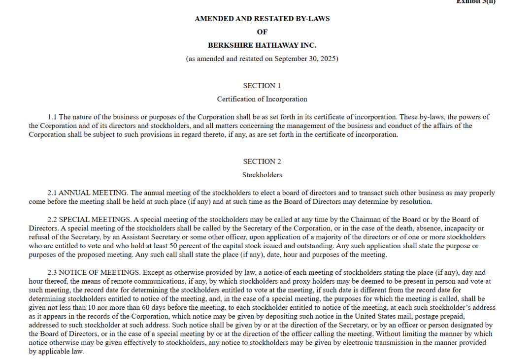 伯克希尔修改公司章程