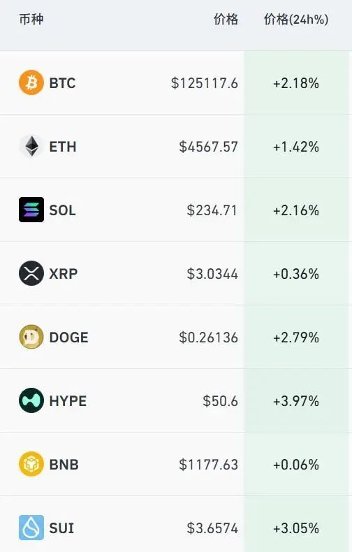 10月5日,加密货币普遍上涨。其中,比特币涨超2%,突破125000美元。狗狗币也涨近3%。