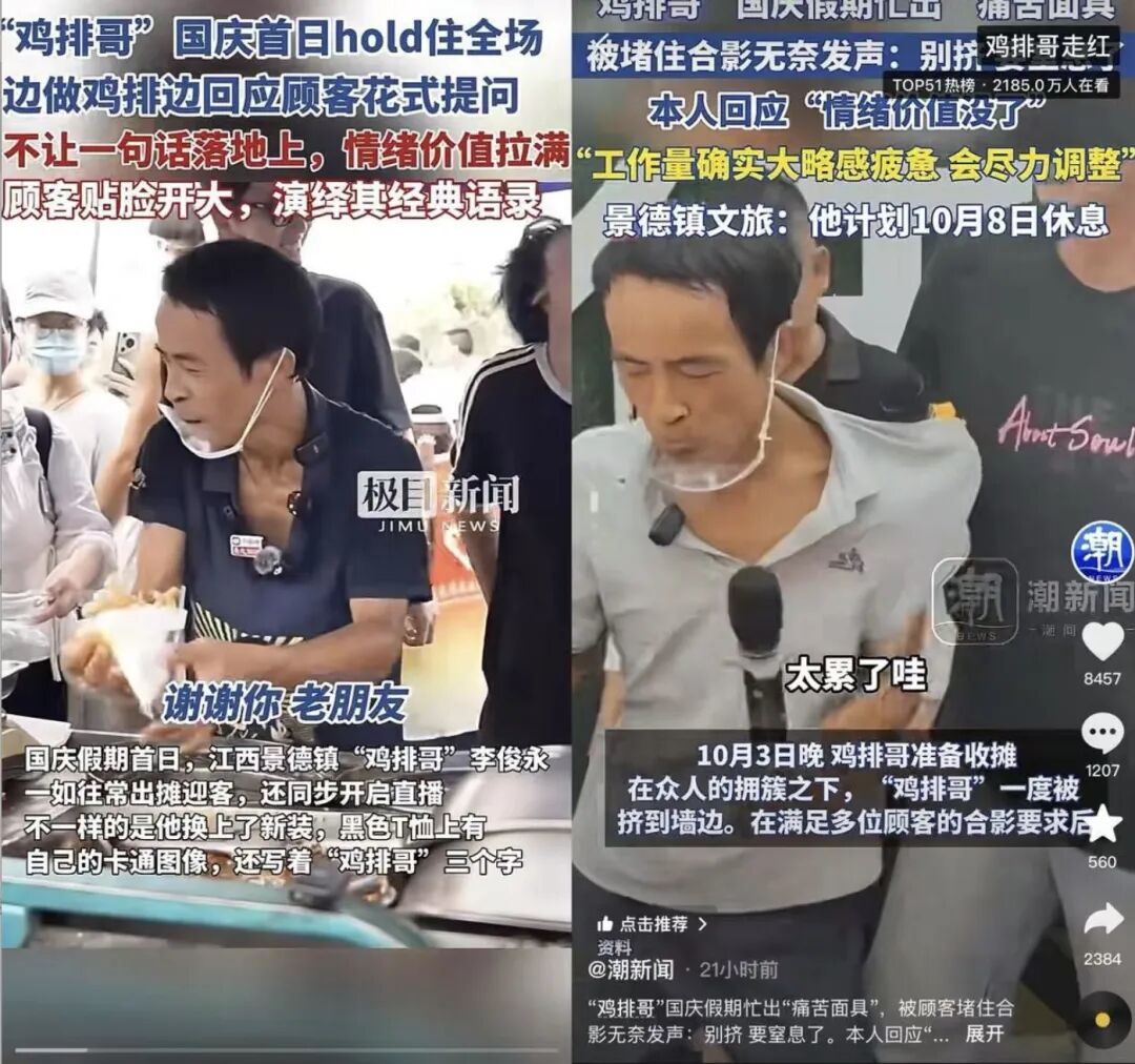 有网友称,“鸡排哥”明显很疲惫,感觉他“累到没有情绪价值”。3日晚间,鸡排哥准备收摊时一度被顾客挤到墙边,要求合影。他无奈发声:“我是一点空气都没有了,人都要窒息了。” 据都市快报报道,景德镇市文旅局工作人员透露,国庆期间“鸡排哥”为了游客加班加点,当地经常建议他多注意休息。该人员表示,当地已协调相关人员在摊位维持秩序,“鸡排哥”是否开门店需要进一步考虑。