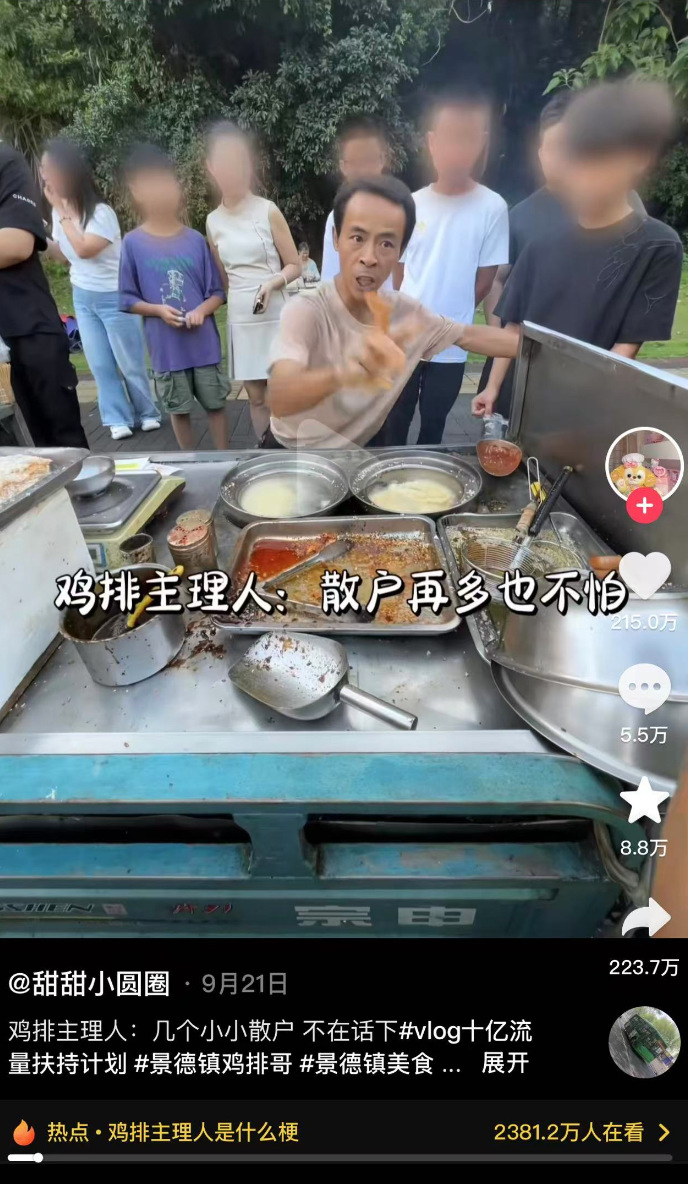 日前,鸡排哥荣获景德镇文旅推荐官,并在座谈会上承诺食品安全。当地还成立了工作专班、保洁专班等维持现场秩序。这一切都表明,至少在接下来一段时间里,鸡排哥不再只是一个单纯的小吃摊“主理人”。