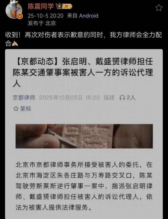 陈震车祸受害方已请律师,陈震:我方律师会全力配合